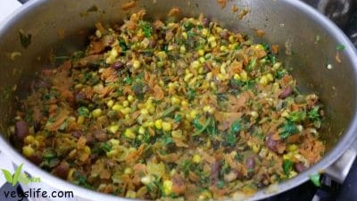 نقلي الكراث بالزيت ونضيف الكرفس ونخلط قليلا ثم الجزر المبروش مع التحريك من وقت لاخر لخمس دقائق ثم الفاصوليا الحمرا والذرة والبهارات والملح ونتركهم ليستو مع التخليط وعند الاستواء نضيف الكزبرة الناعمة ونخلط لدقيقة ثم نطفئ النار ونخلط الخضرة جيدا مع الارز