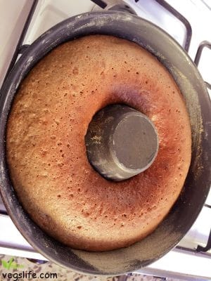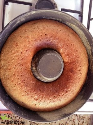 نخبز لمدة ٤٠ /٤٥ دقيقة او حتى نضع عودة أسنان قريب للوسط دون ان يلتصق المزيج بها قم نحمره قليلا من الأعلى