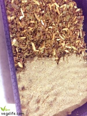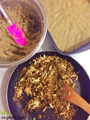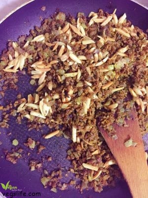 ثم نقلقله بمقلاة غير قابلة للالتصاق مع ٥ ملاعق زيت و نضيف البصلة المفروكة ناعم والبهارات و الملح وتتركهم ليتحمرو ثم نطفئ النار و نضيف الصنوبر او اللوز المحمص و نخلط