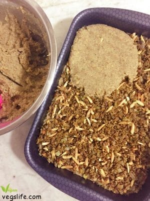 ندهن الصينية بزيت ثم نضع نصف مقدار الكبة و نضع الحشوة ثم ما تبقى من الكبة ليغطي الحشوة