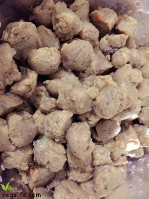 بعد ان تصبح قطع بروتين الصويا طرية نعصرها جيدا ونقطعها لقطع اصغر حيث يصبح تقطيعها طريا باليد