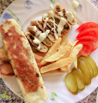 نضع ملعقة صوص الثوم على الخبز ثم نضع ملعقتين بروتين الصويا اوحسب الرغية وكبيس الخير ونلف الساندويش و نسخنها بسخان الساندويش .. تقدم مع البطاطا المقلية والبندورة والكبيس